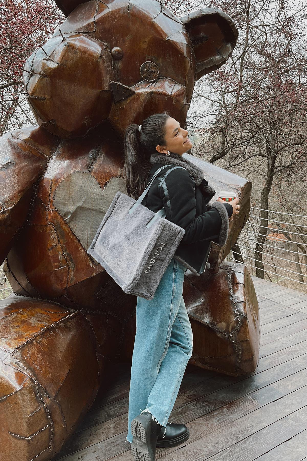 Gri Suni Kürk, Logo Nakış Detaylı, Bir iç cepli, kadın alışveriş çantası - shopper çanta - tote bag